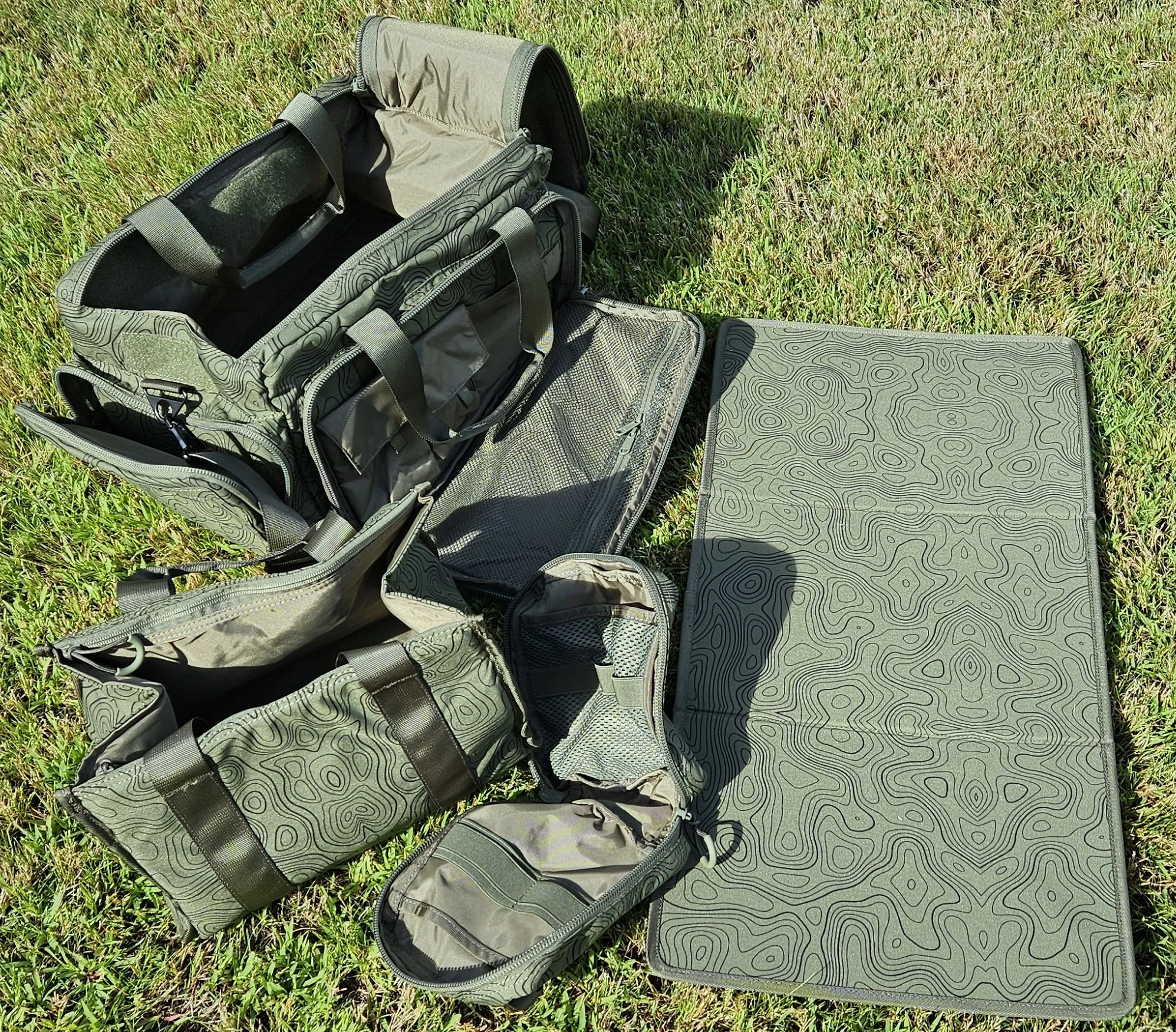 The Gritr Tactical Range Bag is really a do all bag. In general, it starts as a 18 inch x 12 inch x 10 inch exterior size. Inside the main compartment is a removable tote, a removable mat, and a medical pouch. On each side are large zipper compartments. On one end is another zipper compartment. On the other end is an open pouch. The main compartment is then covered by a highly velcroed dual zipper flap. Gritr offers the bag in a multitude of colors and patterns. I chose the Green Topo pattern, even though I was torn between it and Splatter.