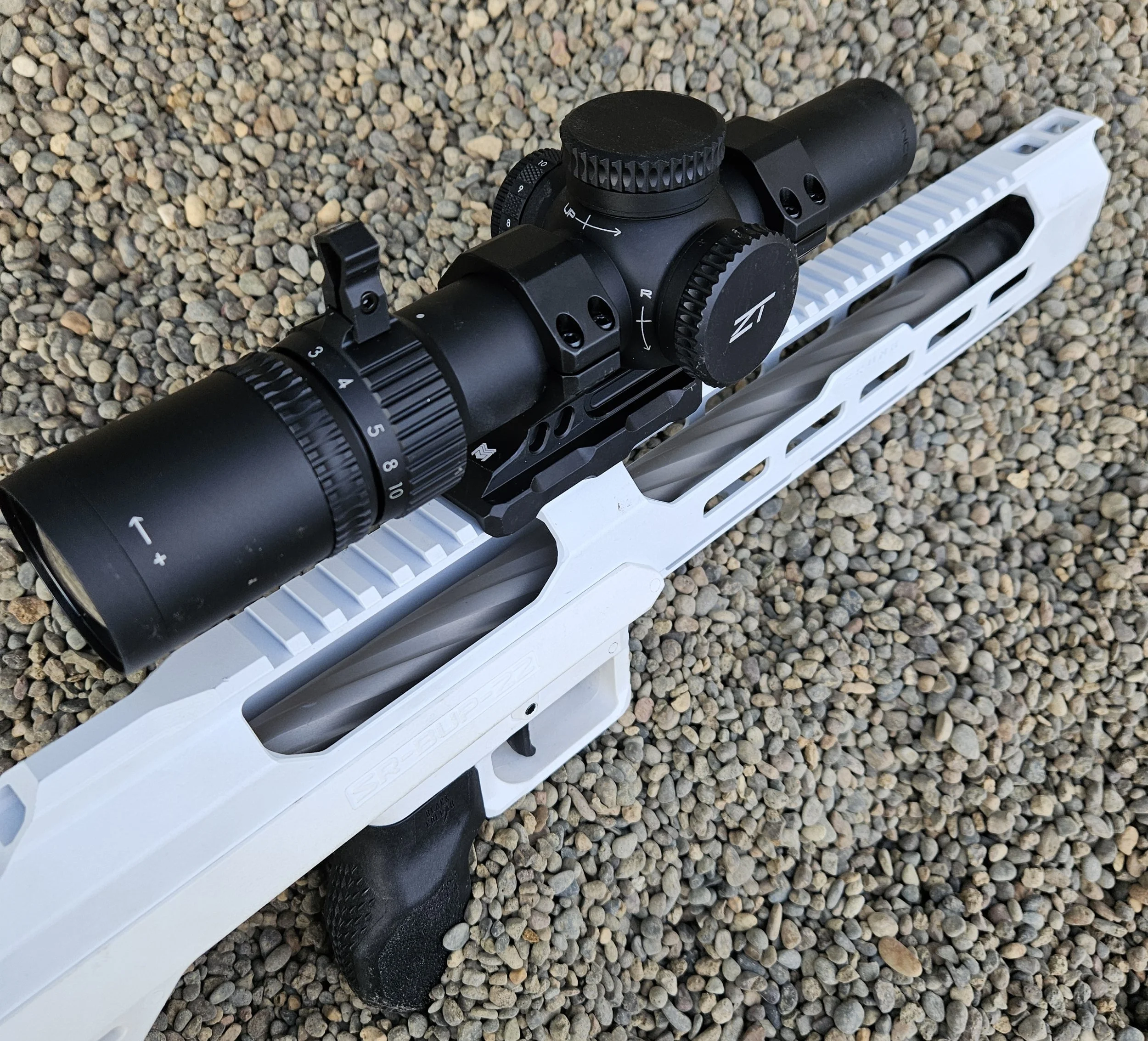 I was looking for something different to do with a 10/22 that I had laying around. SRU had asked if I wanted one of the Sruna's to review. After using their SARB-15 AR bullpup kits, and liking it so much, I agreed. The Sruna's come in 3 standard colors: Black, Tan, and OD Green. However they currently have a limited edition White Sruna-22. I decided on the white one because it looks more like a space blaster than the other three. All of the Sruna chassis are the same, except for the color.
